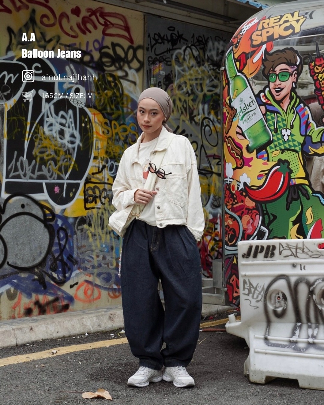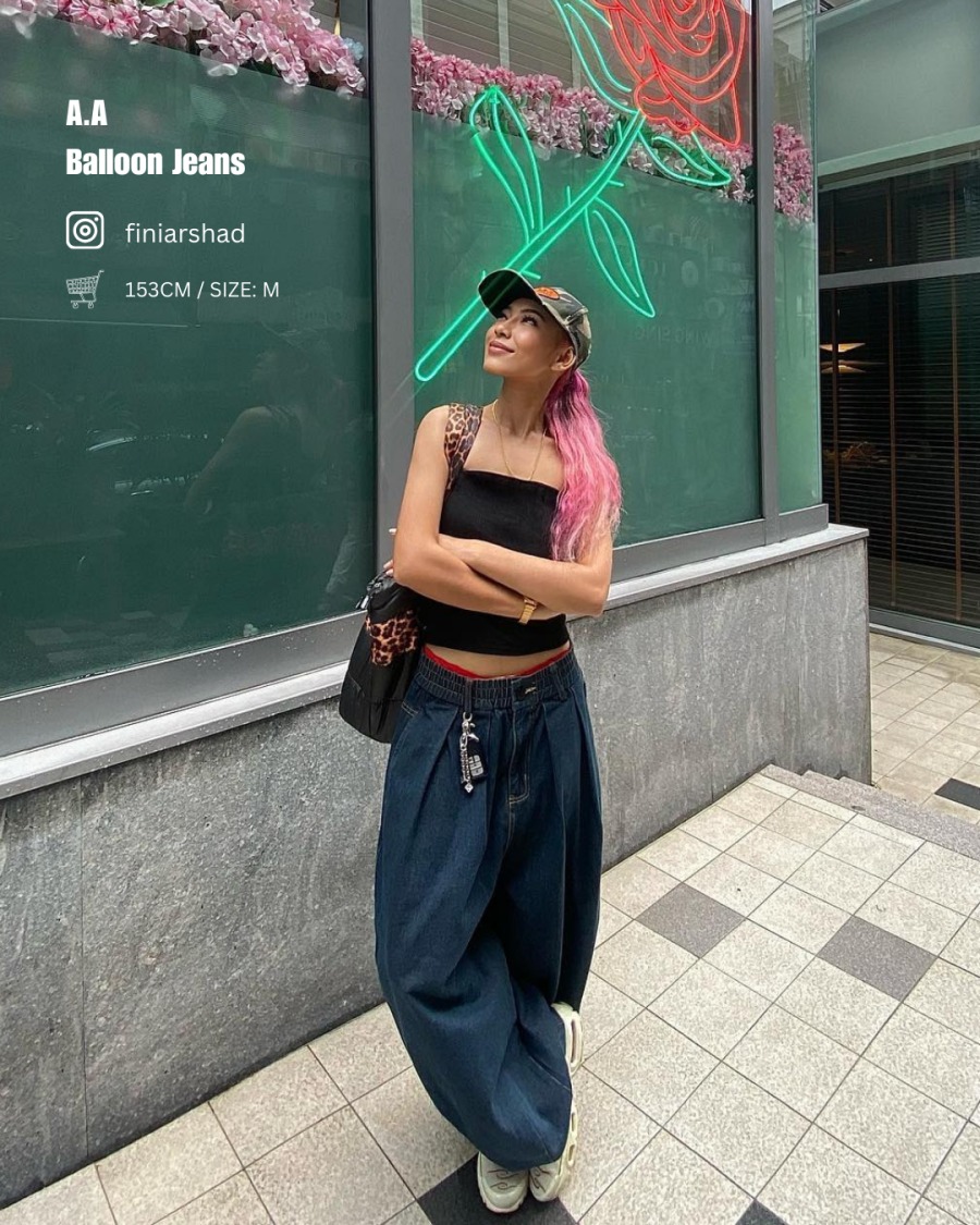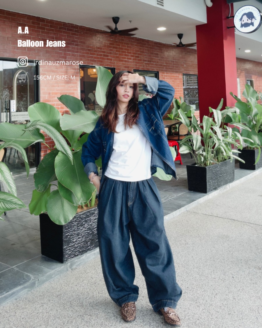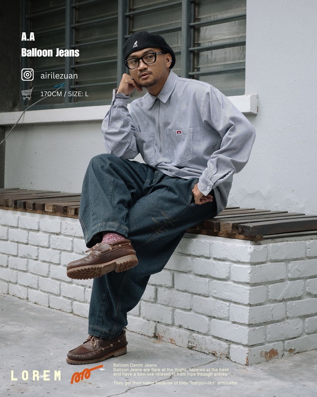 Balloon Jeans are flare at the thighs, tapered at the base, and have a bow-like relaxed fit from hips through ankles.